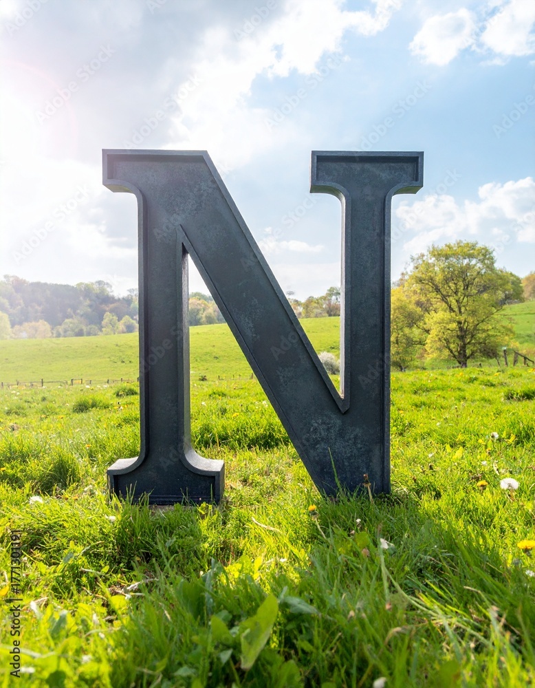 Big metal letter N in a beautiful springtime countryside landscape. AI generated image. #1771301191