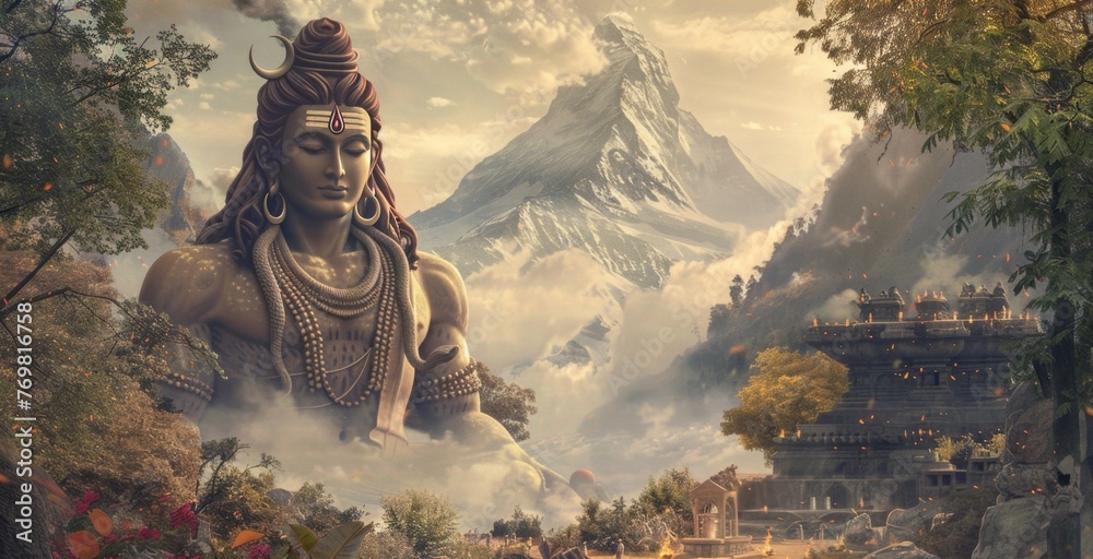 big sculpture of lord shiva with temple and mountain landscape #769816758