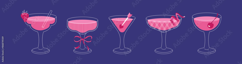 Big set of pink outline cocktails with Valentine's garnish. Vector illustration of romantic drinks in crystal glasses. Cute drinks with strawberry, ribbon bow, cherry and cupid arrow #1868795109