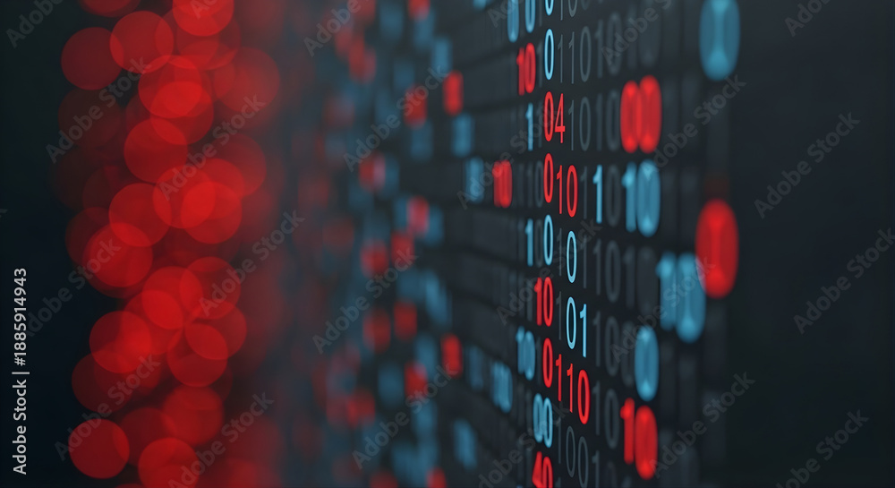 Binary code flows through a digital pathway with red and blue lights in a dark background 212 #1885914943