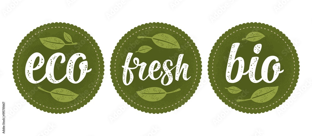 Bio, eco, fresh calligraphic handwriting lettering and leaf. #195781667