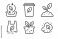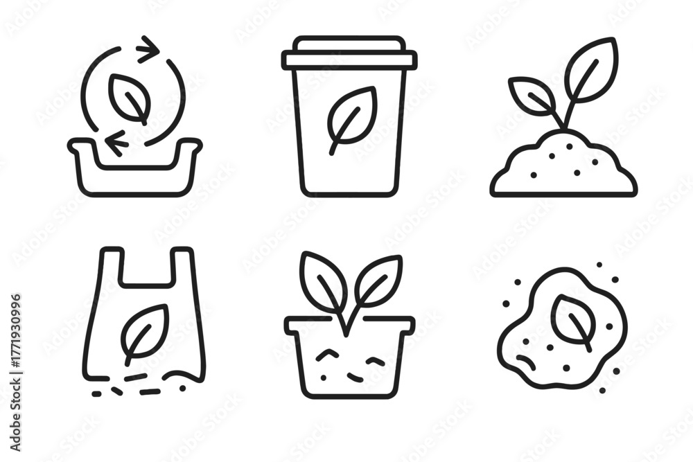 Biodegradable Plastics Icons. Line style icons of biodegradable plastics: composting process, green bin symbol, soil breakdown #1771930996