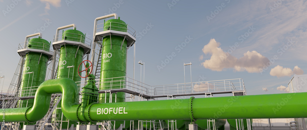 Biofuel factory producing green fuels from biological sources. Concept of green fuel. 3D illustration #1329214156