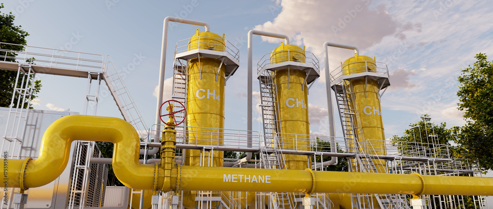 Biogas upgrading facility that produces pipeline-grade biomethane for distribution. 3D illustration. #1755959465