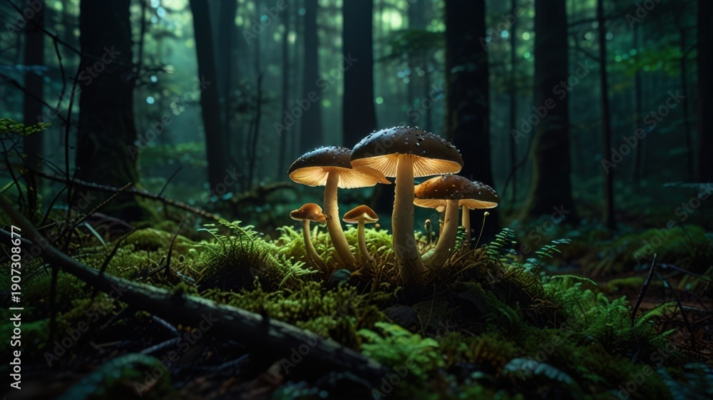 Bioluminescent Mushrooms Background in Dark Magical Forest #1907308677