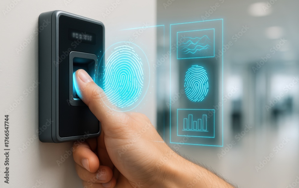 Biometric Access: A close-up shot of a finger activating a biometric scanner, the scene illuminated with digital data representations, highlighting the intersection of security and modern technology. #1766547744