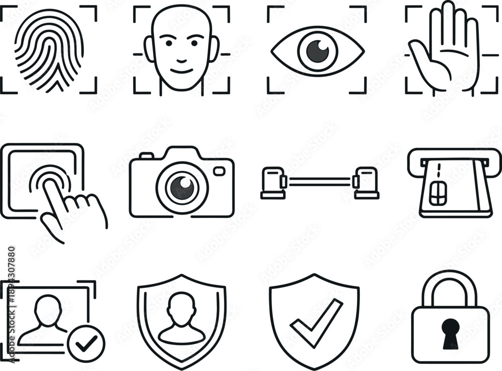 Biometric Scanner Icons. Line style vector icons of biometric scanner: fingerprint, face scan, iris scan, palm scan; sensor pad, #1894307880