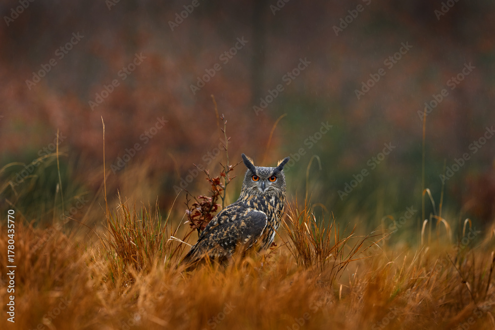 Bird in the wood meadow. Owl in forest habitat, green moss stone. Eurasian Eagle Owl witb big orange eyes, Poland. Bird in autumn wood among the stones. #1780435770