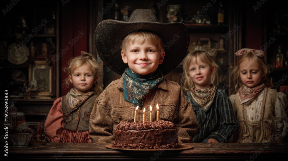 Birthday celebration theme for party event. A young boy wearing a cowboy hat and scarf, seated at a table with a birthday cake adorned with lit candles, surrounded by four other children. #1925890843