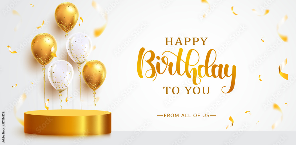 Birthday greeting vector background design. Happy birthday to you text with gold podium and balloons element in white space for elegant birth day. Vector illustration. #537154876