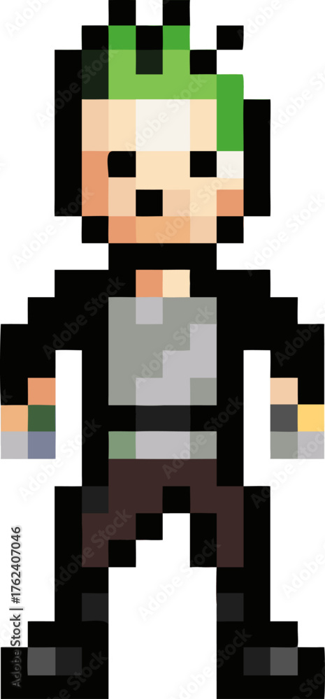 8 bit person, a pixel art drawing of a small game character wearing a red cap and dark outfit. Retro style punk avatar with a simple design, ideal for vintage video game graphics. #1762407046