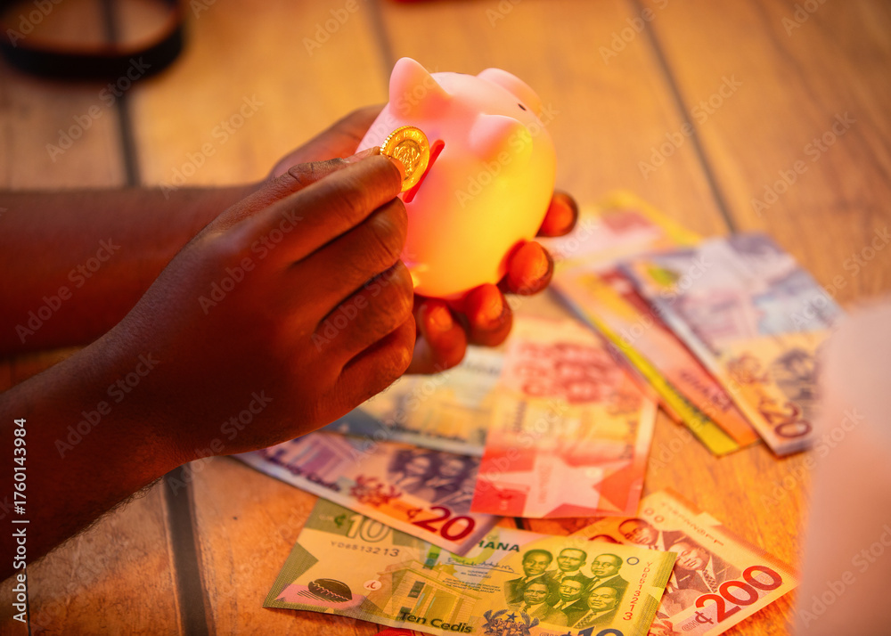 Black african hands holding pink piggy bank putting a coin into the piggy bank's slit. The hands are on a wooden table with Ghanaian cedi notes scattered around. #1760143984