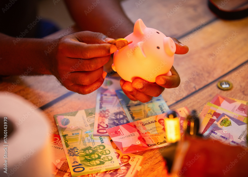 Black african hands holding pink piggy bank putting a coin into the piggy bank's slit. The hands are on a wooden table with Ghanaian cedi notes scattered around. There's a pen holder with pens, maker. #1760143970