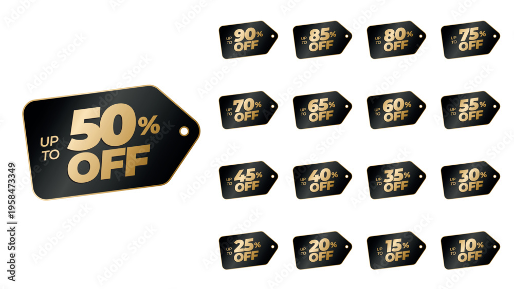 Black and gold discount tag set with percentage off. Premium sale badges collection. Luxury promotion and marketing design with 90, 85, 80, 75, 70, 65, 60, 55, 50, 45, 40, 35, 30, 25, 20, 15, 10% off. #1958473349