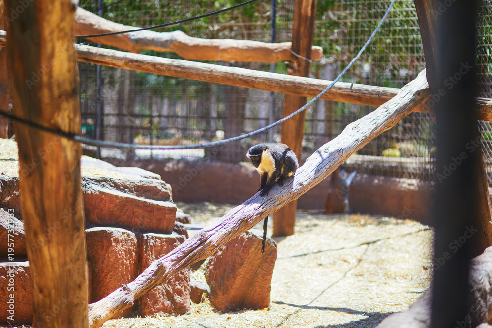 Black and white colobus monkey climbing along a wooden branch inside an enclosure at Monkey Park in Tenerife, Canary Islands, Spain. Exotic primate scene with zoo habitat details. #1957732983