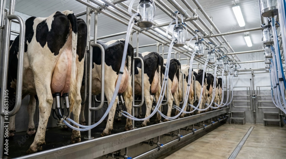 Black and white holstein frisian cows standing in a clean, contemporary milking parlor, with automated machines collecting milk in a dairy production facility #1968531305