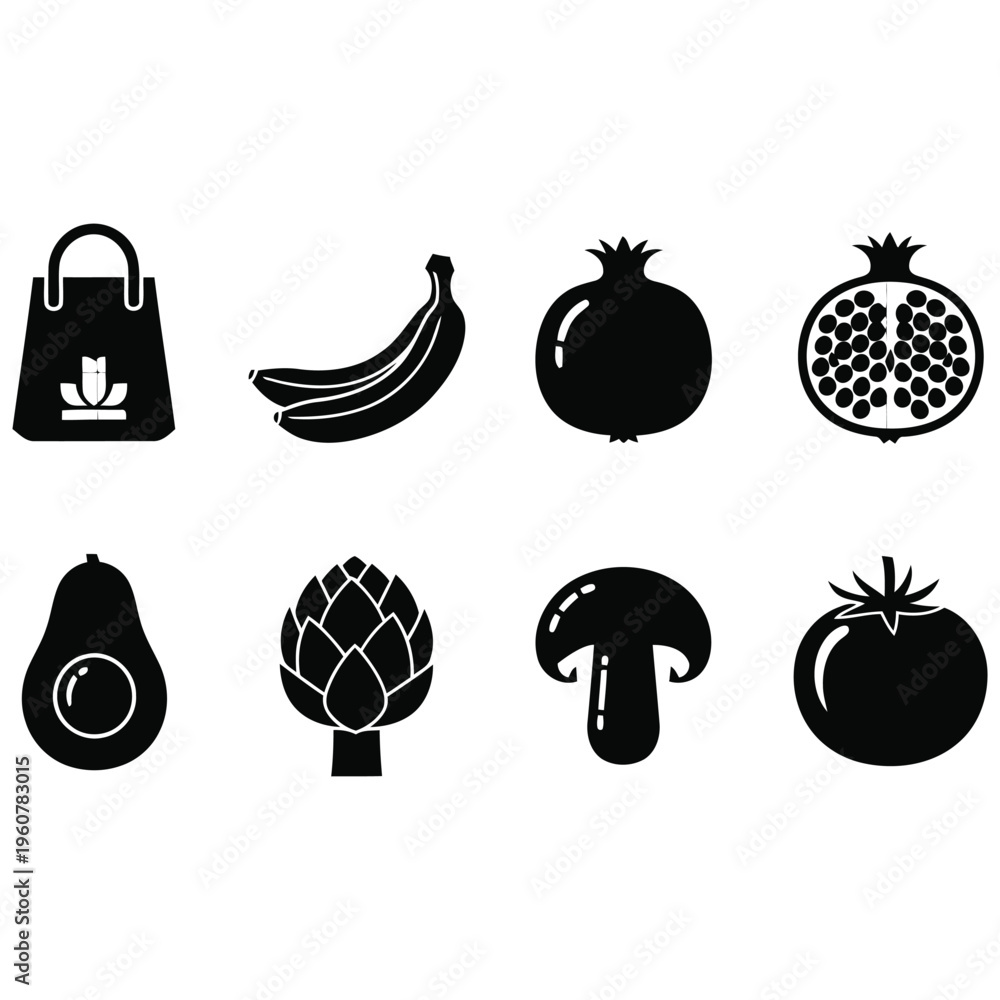 Black and white icons of various fruits and a shopping bag isolated on white background #1960783015