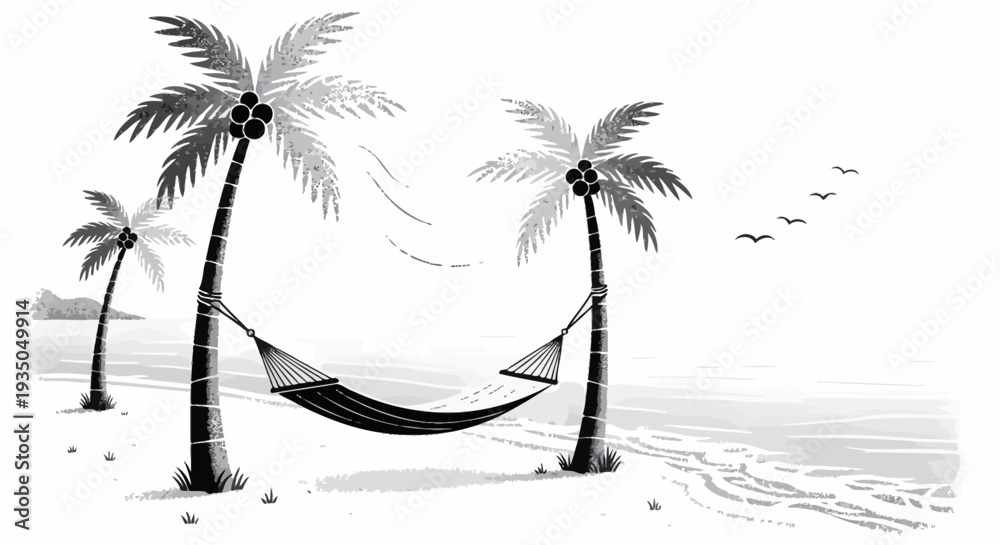 Black and white illustration of a serene tropical beach scene with a hammock strung between two palm trees, footprints in the sand, and birds flying over the ocean. #1935049914