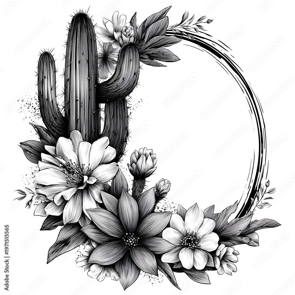 Black and white illustration of cactus surrounded by flowers in a circular design with clear lines and detailed features #1971515565