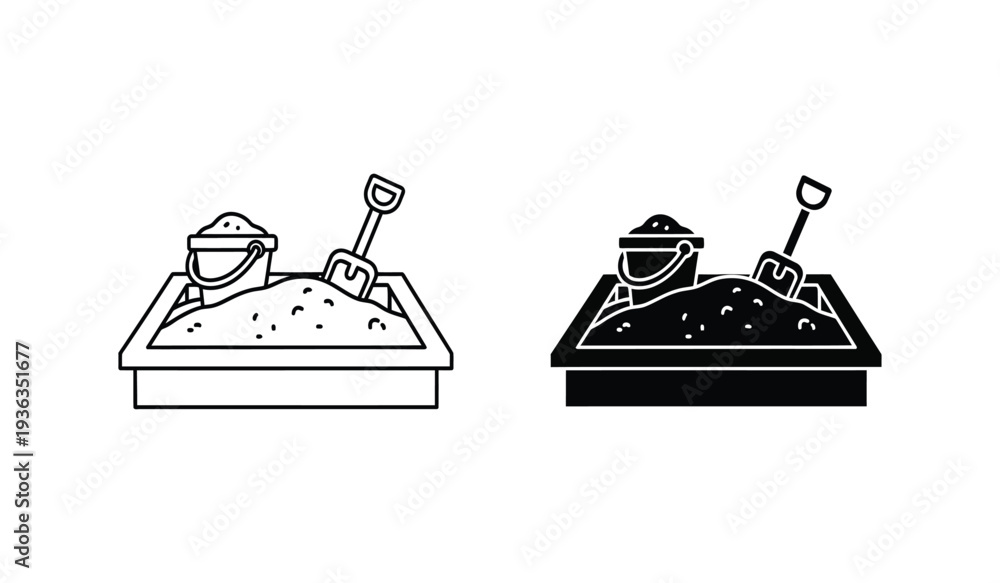 Black and white line art illustrations of sandboxes with tools and buckets #1936351677
