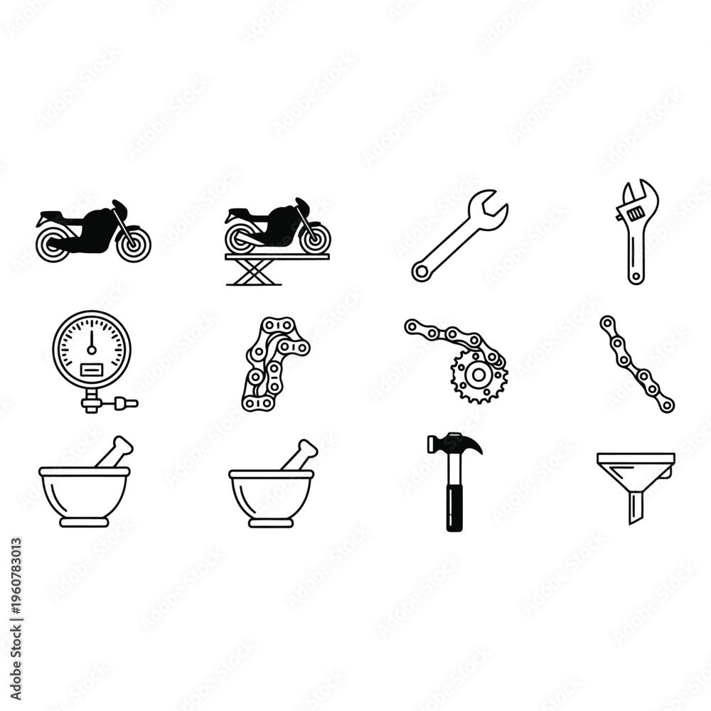 Black and white line icons of various tools and motorcycle parts isolated on white background #1960783013