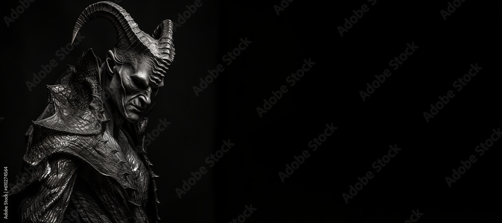 Black and white photorealistic studio portrait of the demonic being lucifer the devil on black background. Generative AI illustration #610274564