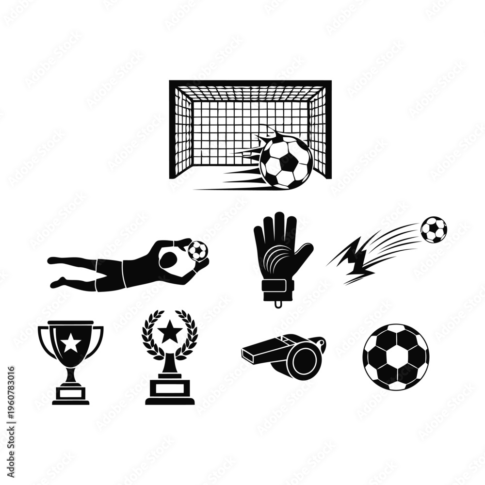 Black and white soccer icons set including goal, ball, and trophy isolated on white background #1960783016