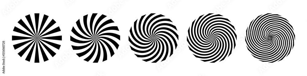Black and white spiral illusion background. Circus backdrop. Abstract hypnotic radial patterns with optical distortion and twisted vortex effect. Dynamic graphic vector illustrations set. #1356160728