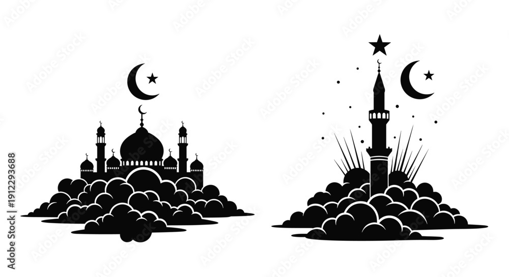 Black and white vector illustration featuring Islamic mosques and crescent moons #1912293688
