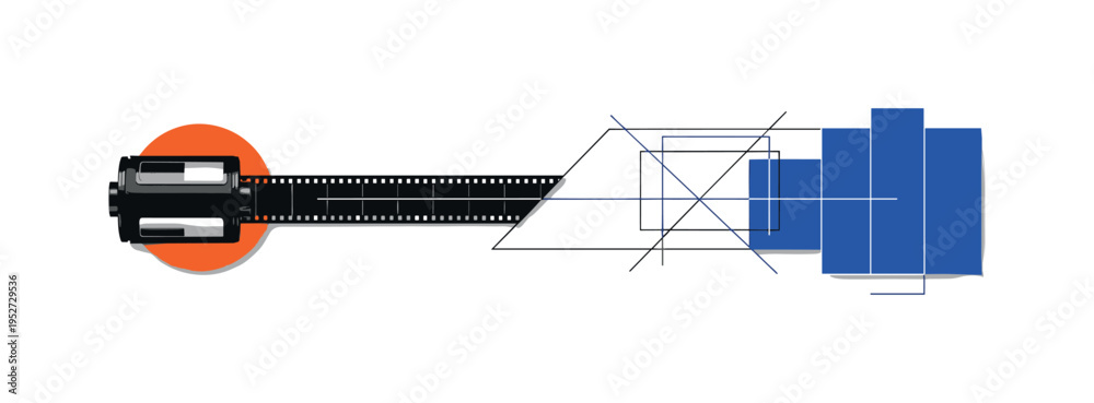 Black and white vintage camera film roll unspooling into abstract geometric strip across frame, bright orange circle anchoring origin point, blue rectangular #1952729536
