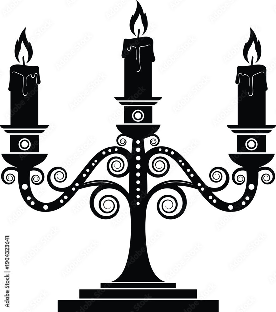 Black and white vintage candelabra silhouette illustration, classic three candle holder design, elegant decorative antique lighting icon for gothic, luxury, #1904323641