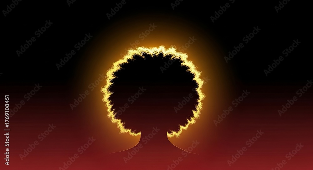 Black Awareness Day gradient from black to maroon red, golden sunlight casting halo behind Afro hairstyle silhouette #1769108451