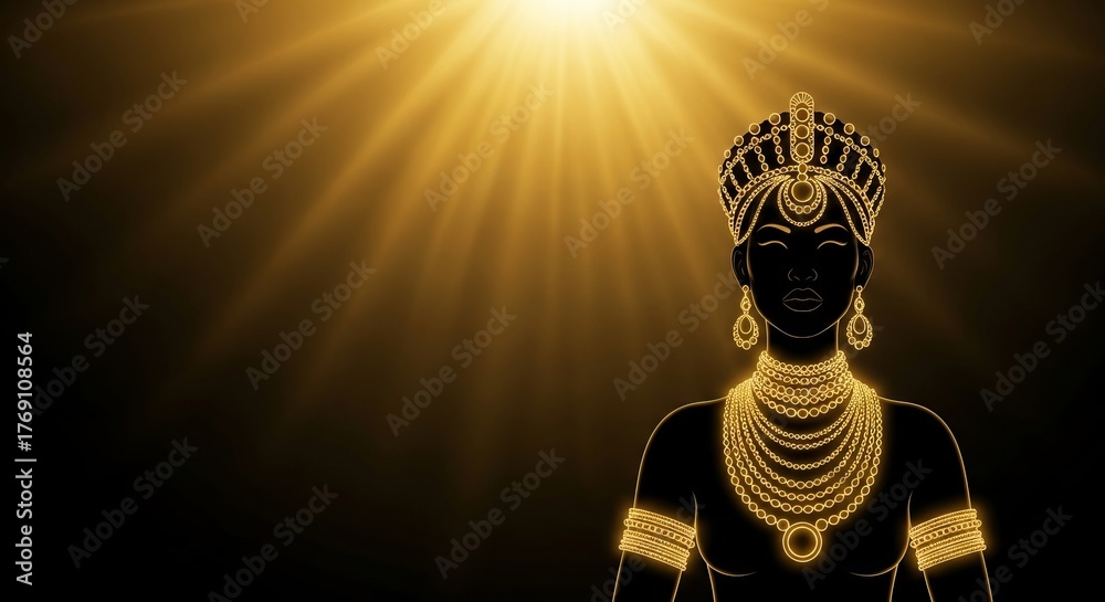 Black Awareness Day gradient from black to warm gold, female silhouette with beaded crown and jewelry glowing softly #1769108564
