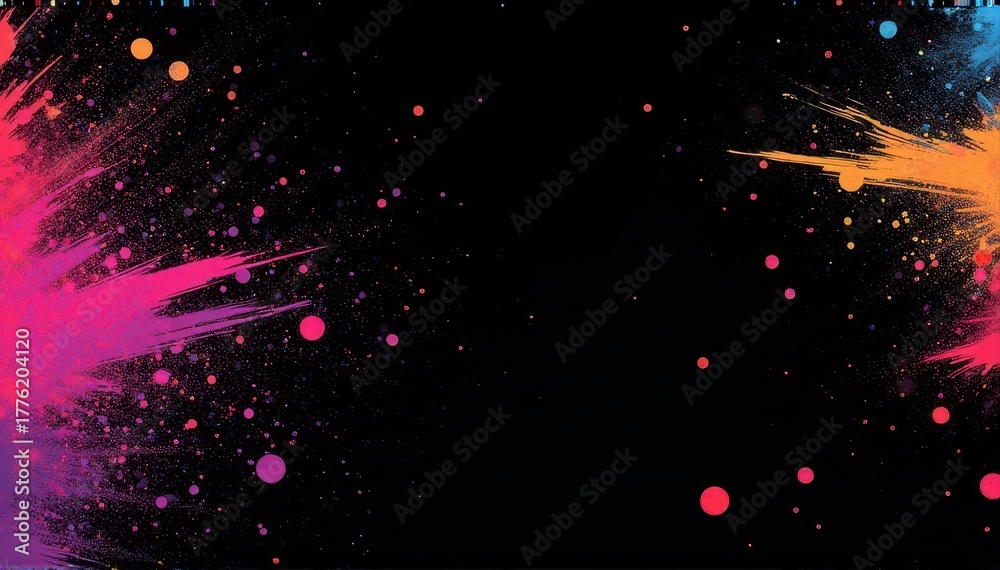 Black background with vivid neon paint splashes and splatters in pink, orange, and blue, creating a dynamic modern abstract art backdrop. #1776204120