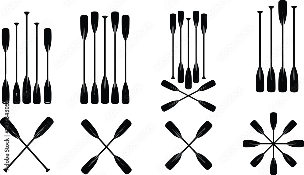 Black boat oar and paddle silhouettes set featuring crossed oars, rowing equipment, nautical symbols, water sports gear, canoeing and kayaking icons. #1874543059