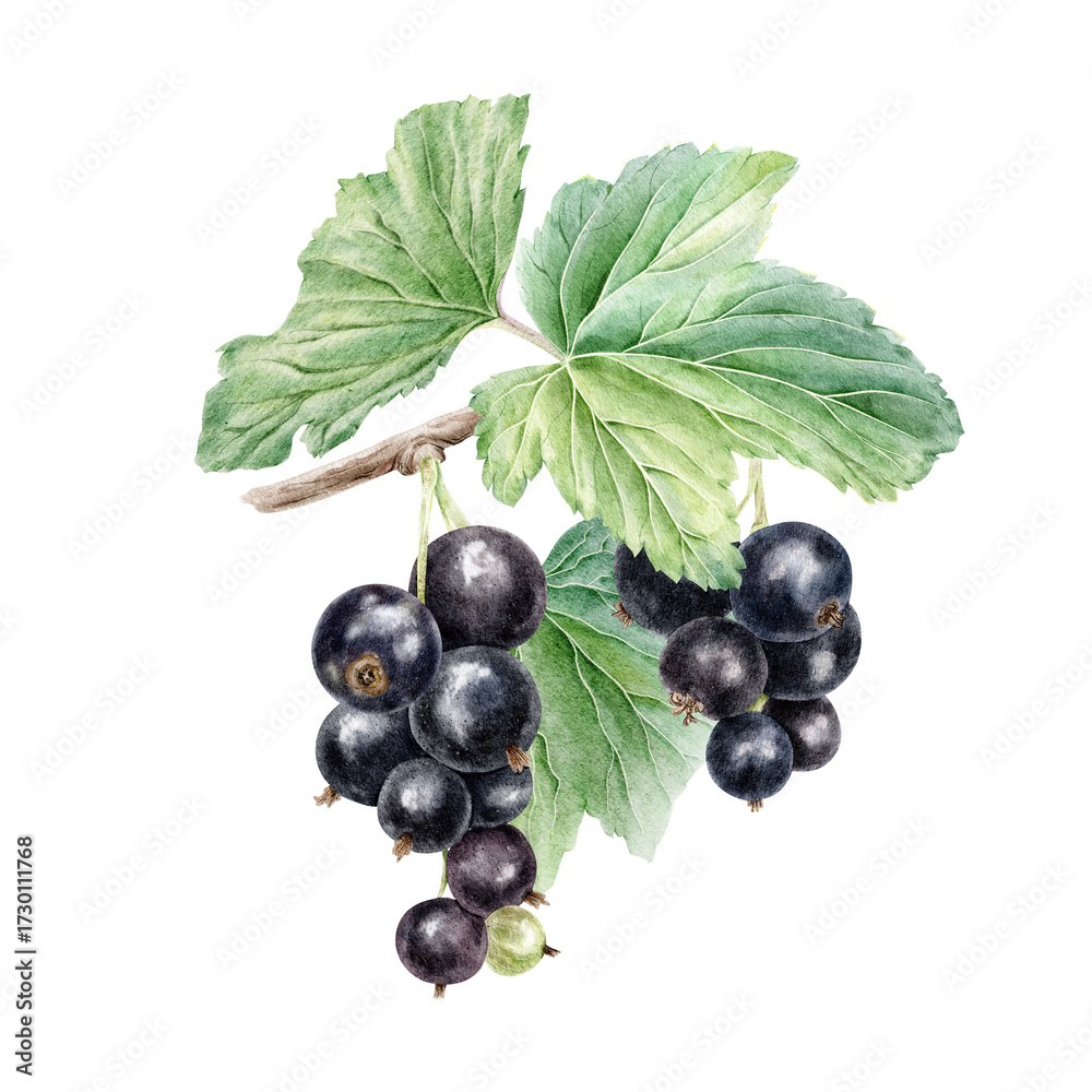 Black currant berry branch and leaves isolated watercolor hand drawn illustration. Garden plant berries botanical clip art. Summer fruits for cosmetic packaging, card, textile, fabric #1730111768