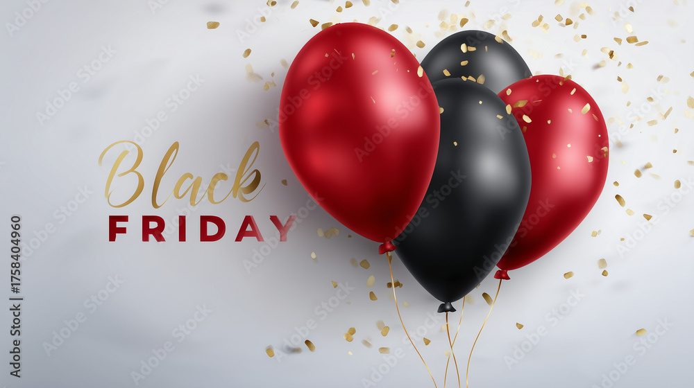 Black Friday sale banner with red and black balloons, golden confetti, white background, modern luxury design, elegant typography, holiday discount promotion, festive composition, #1758404960
