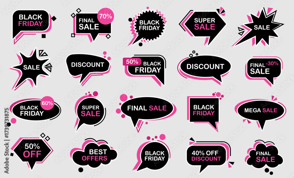 Black Friday sale label set. Discount speech bubbles with text offers, percentage signs and bold graphic design #1739731875