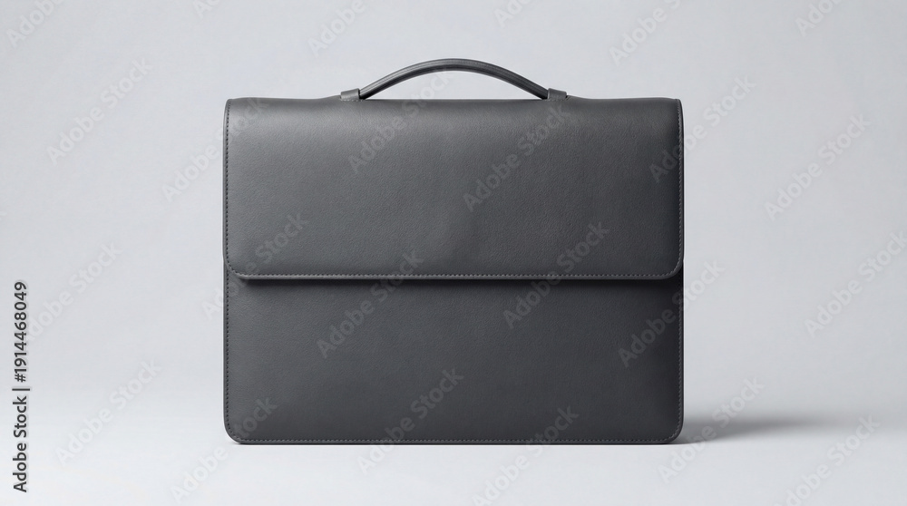 Black leather briefcase front view on grey background. Minimalist professional bag for business. Sleek executive accessory for work #1914468049