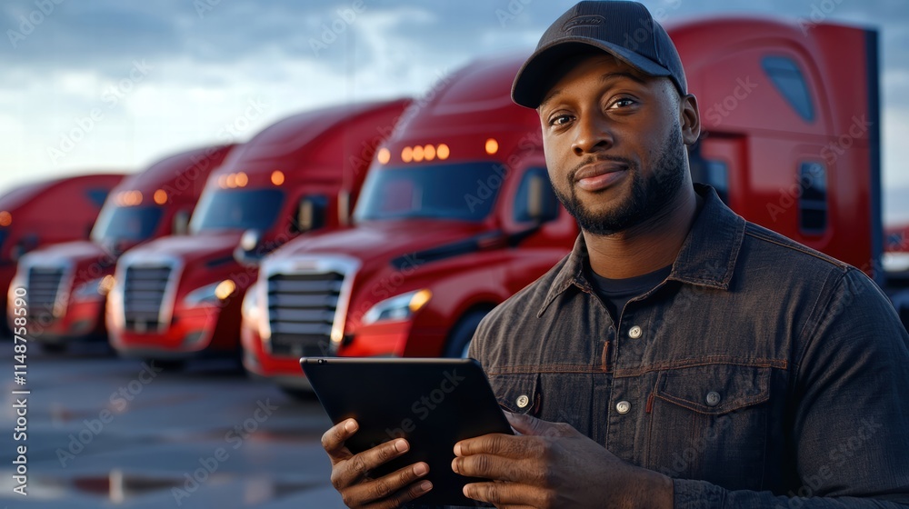 Black male truck driver using a tablet in front of red semi-trucks, showcasing modern logistics. #1148758590