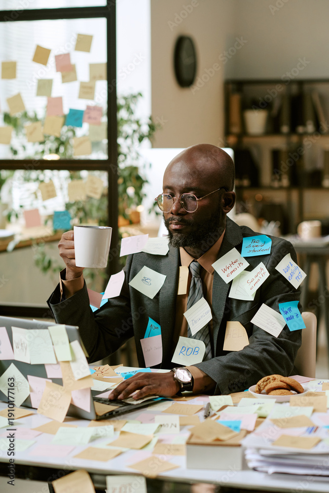 Black man wearing suit sitting at desk covered in sticky notes, holding coffee mug, working on laptop surrounded by reminders and business documents in office setting #1910177163