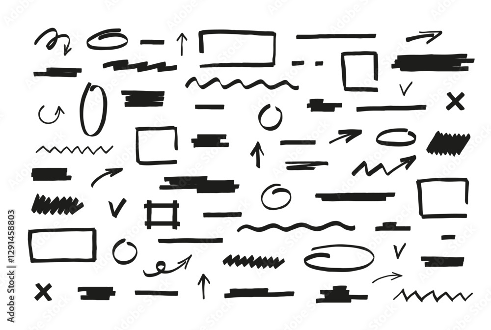 Black marker pen or highlighter lines and shapes vector set, permanent or brush pen strokes, arrows, geometric shapes #1291458803