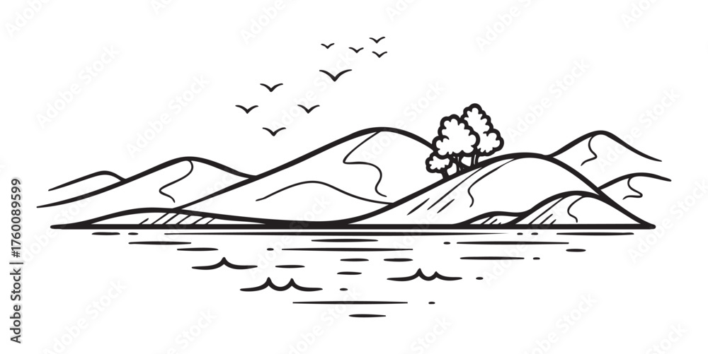 Black outline drawing of a serene mountainous landscape with a body of water in the foreground and birds flying in the sky. #1760089599