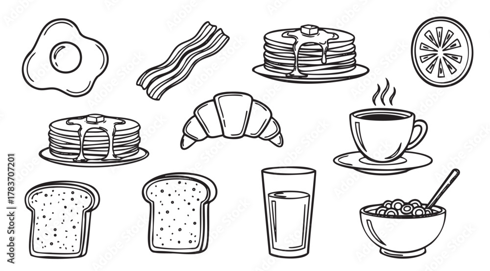 Black outline icons of various breakfast foods including eggs, bacon, pancakes, toast, croissant, coffee, cereal, and a glass of juice. #1783707201