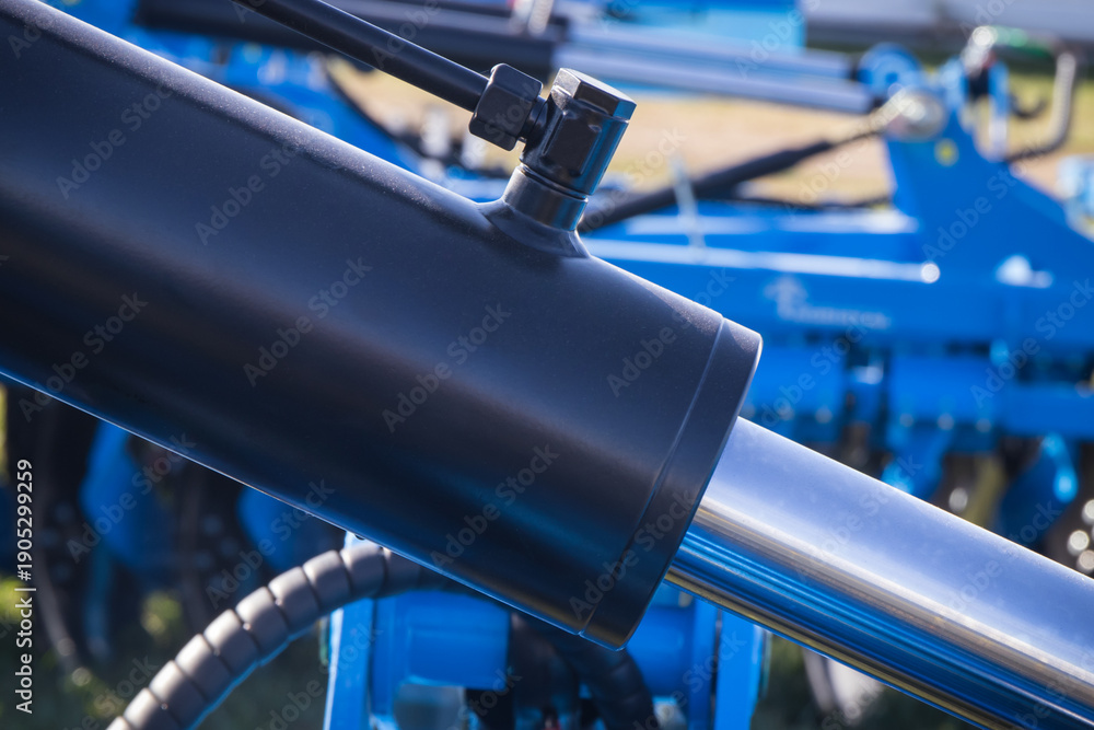 Black pistons or actuators in blue pneumatic or hydraulic machine. Technology #1905299259