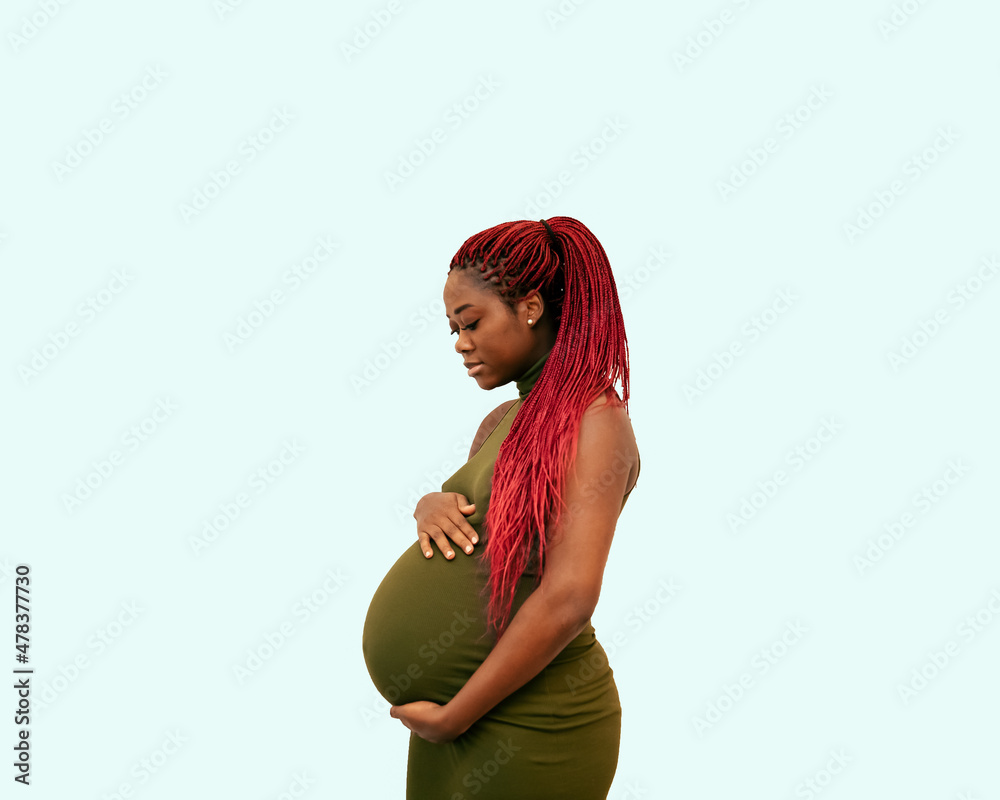 black pregnan woman wearing a green dress on a colorful background #478377730