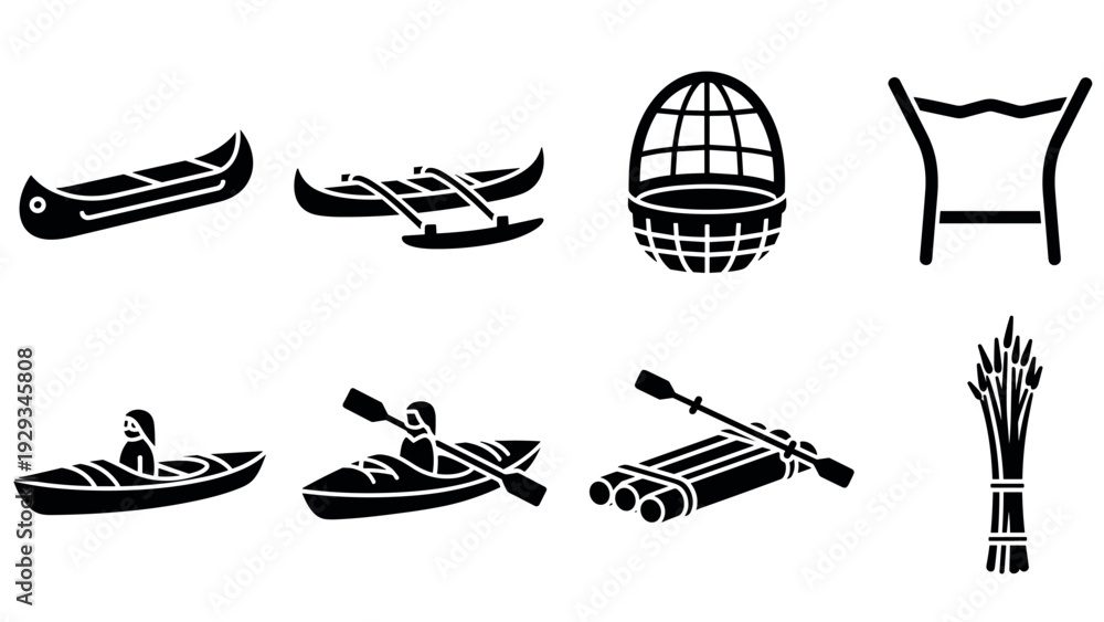 black silhouette icons set of traditional boats raft and paddlers in hand drawn style #1929345808