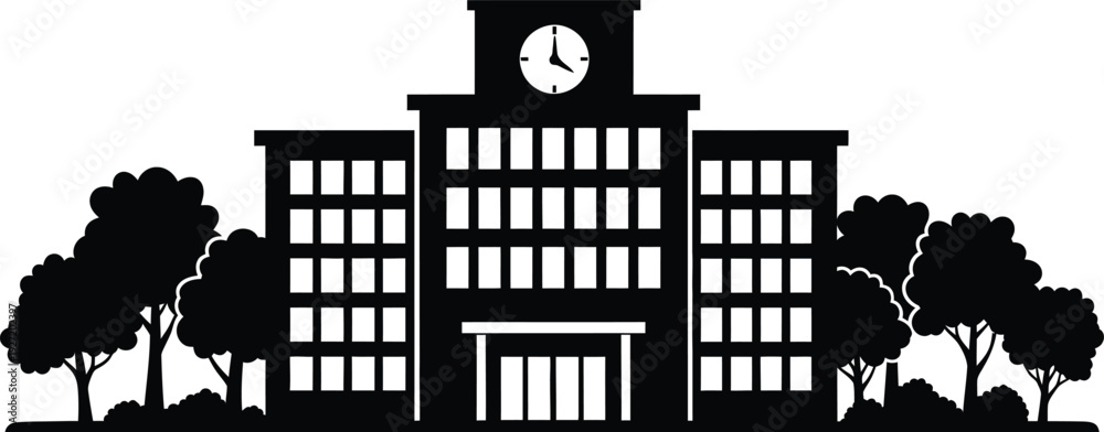 Black silhouette of a classic school building with a clock tower and surrounding trees on transparent background high quality professional detailed #1927202397