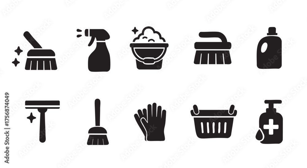Black silhouette of cleaning tools and supplies set including spray bottle, mop, gloves, brush and other, isolated on white background. household chores, cleanliness, home maintenance, icon collection #1756874049