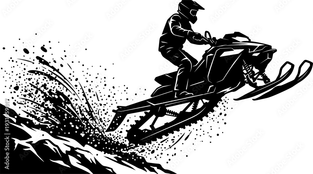 Black silhouette of extreme snowmobile rider wearing full helmet performing high jump with snow spray, dynamic action vector art, sticker design, isolated on white background #1931059017